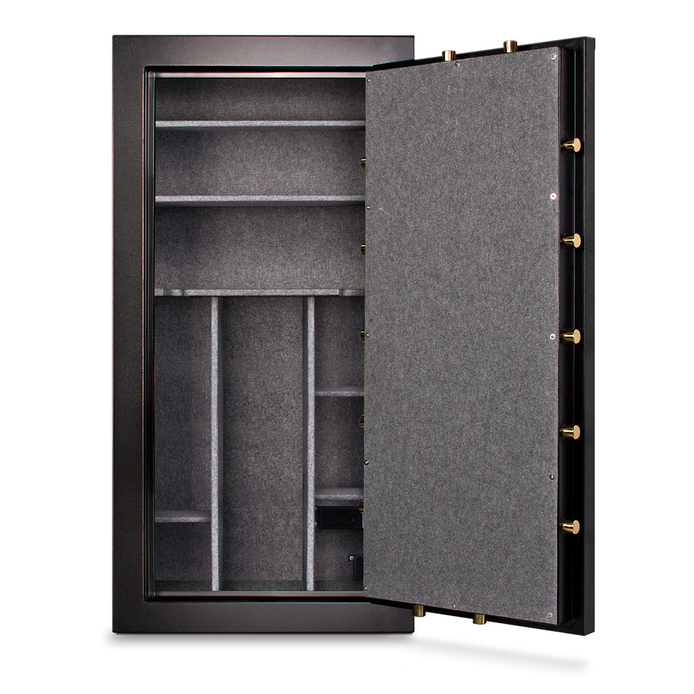 The MBF Series consists of four different types of models. Each model contains a 1-hour fire rating that has been tested under extreme temperatures to withstand a high degree of heat, ensuring that your contents inside your safe are intact and operable. Each safe weighs at least 500 pounds providing strength, durability and confident placement that will prevent your safe from being removed or stolen from its place. To add even more security, each safe contains four anchor holes to be able to secure your safe to the floor for permanent placement. The gun safes have interior shelving that can be adjusted or removed for your storage convenience. Each safe also contains different types of storage capabilities to organize any type of guns you have. Whether you need to store larger firearms such as rifles or shotguns or smaller weapons like knives and handguns, each safe has a nice organized storage system that will hold all types of weapons.